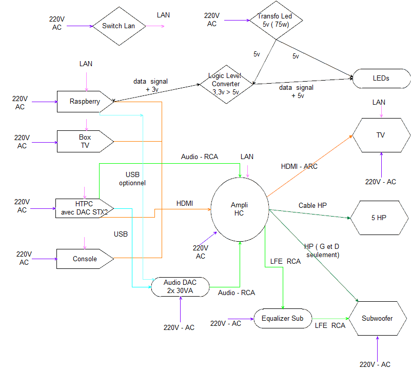 j'ai fais un petit diagramme pour mieux me faire comprendre, et non ce n'est pas une centrale, juste que j'ai pas de pièce dédié pour chaque usage, et j'aime autant le cinema à la musique (mis à part la box internet )