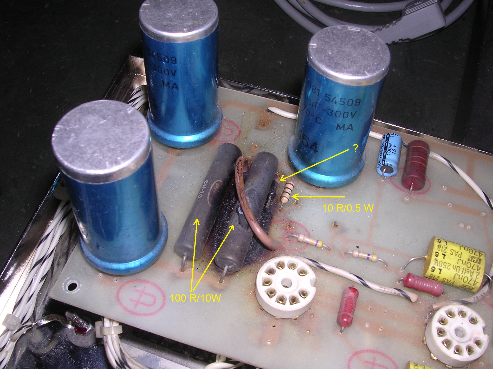 Je viens de m'inscrire sur le forum afin de rechercher une information. J'ai acheté il y a un an environ un ampli JCVerdier 210 d'occasion. Dernièrement un ronflement de forte intensité est aparu sur les 2 voies. J'ai ouvert l'appareil et il y a une (ou 2) qui semble avoir bien chauffé (cf image jointe). Changer les résistances ne me posent pas de problème sauf pour la petite résistance accolée à la résistance de puissance qui a cramé dont je n'arrive plus à lire la valeur. Je pense qu'elle devrait faire 10 R comme sa voisine de droite mais je n'en suis pas certain.