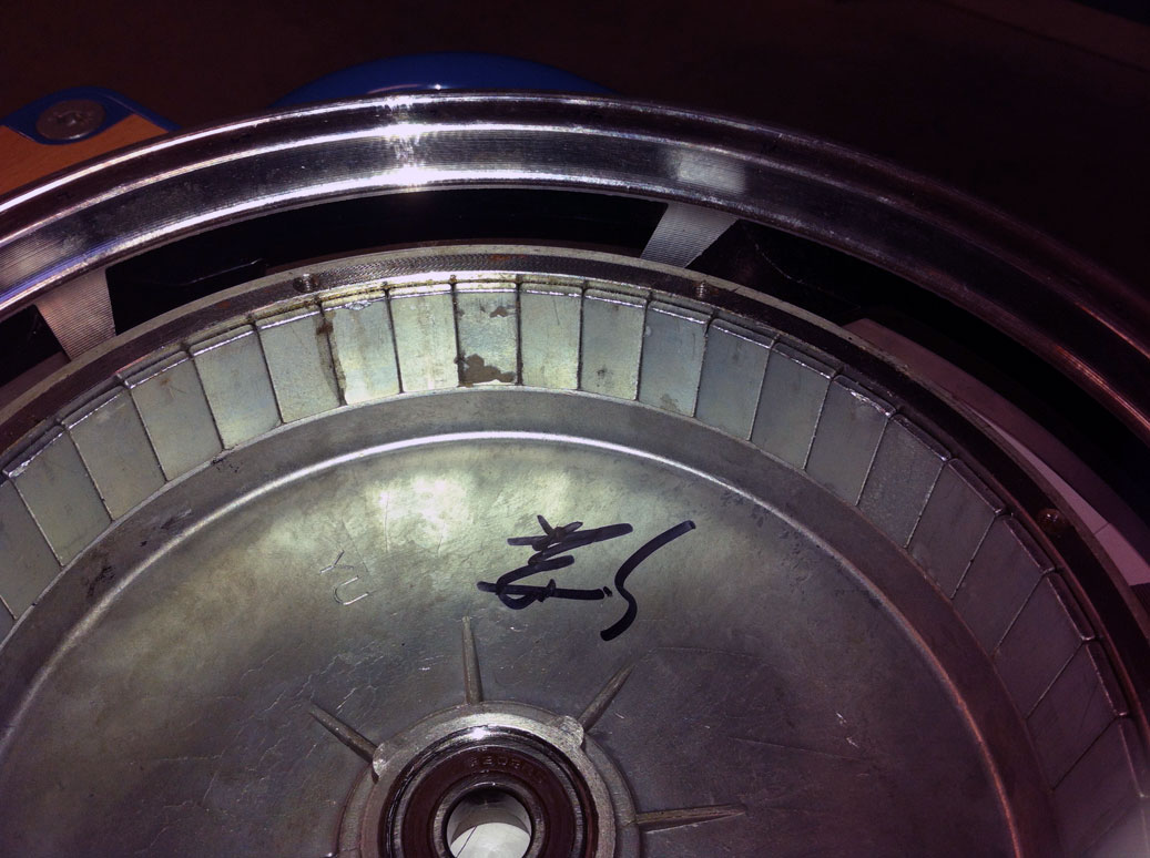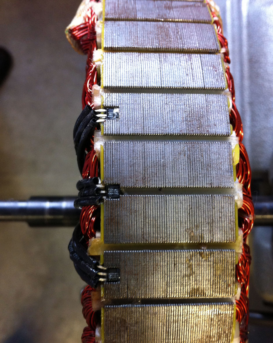 Und hier ist die Elektronik zu sehen, welche die 6 Sensoren zusammenfasst und deren Daten (+ evtl. Fehler) seriell nach außen sendet. Ursprünglich hatte ich 12 Sensoren vorgesehen, aber da würde die Positioniergenauigkeit zum Problem, sodass man nicht viel gewinnen würde. Der Controller hat natürlich einen Bootloader, damit man nicht jedes Mal den Motor aufschrauben muss, wenn man die Programmierung ändern will.