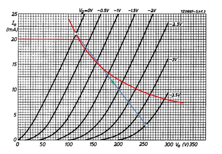 Sur le réseau Ua/Ia du tube EC86, j'ai tracé l'hyperbole de dissipation maximale à 2,4 W et le courant maxi de cathode à 20 mA.