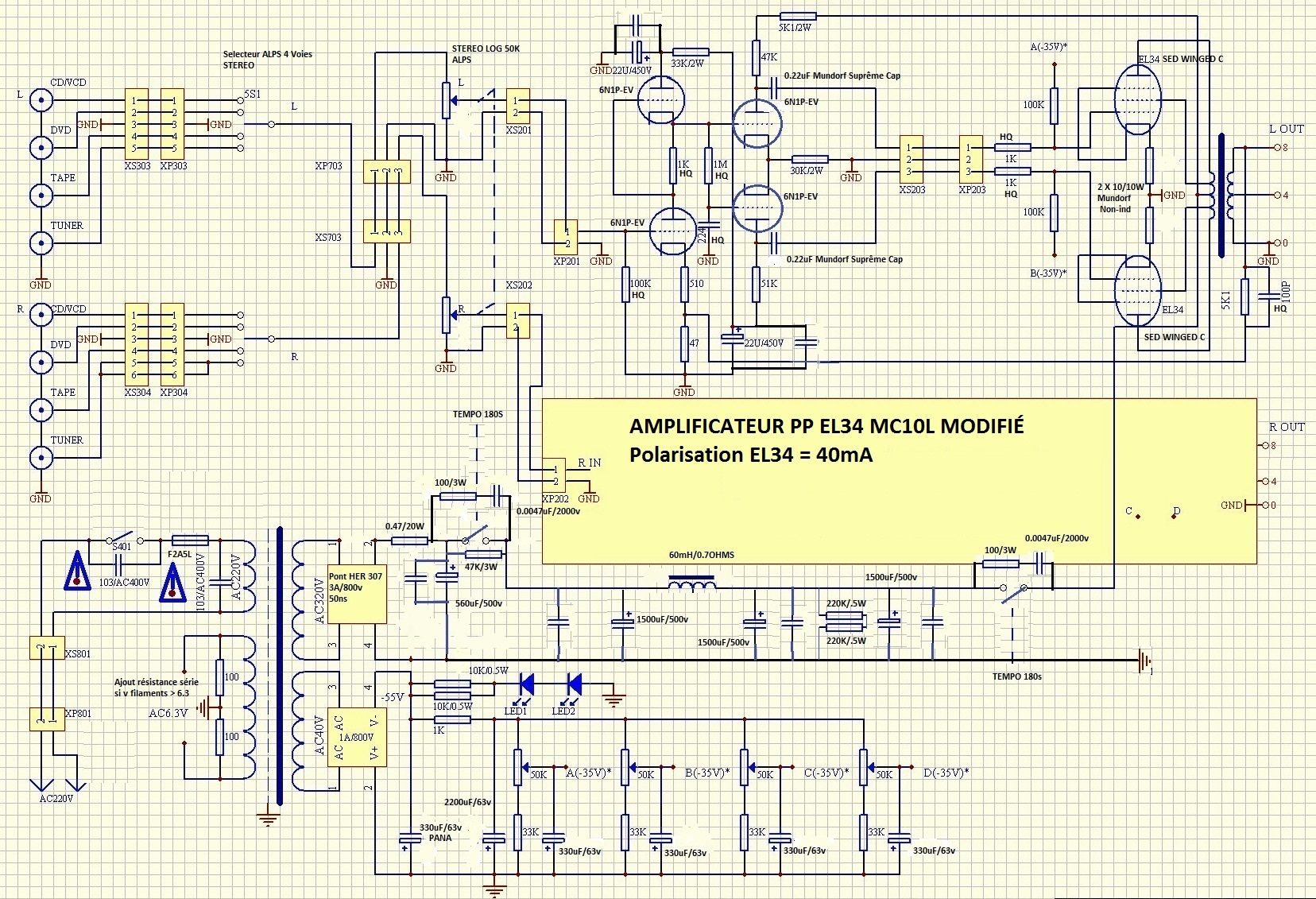 Quoi qu'il en soit, je suis entrain d'effectuer quelques modifications (voir schéma joint) et, au vu d'une prochaine commande chez un fournisseur de composants pour entre autres, changer les 22uF/450v pour des modèles de qualité, je me demandais s'il est encore possible de l'améliorer sans, pour l'instant, toucher aux transfos.