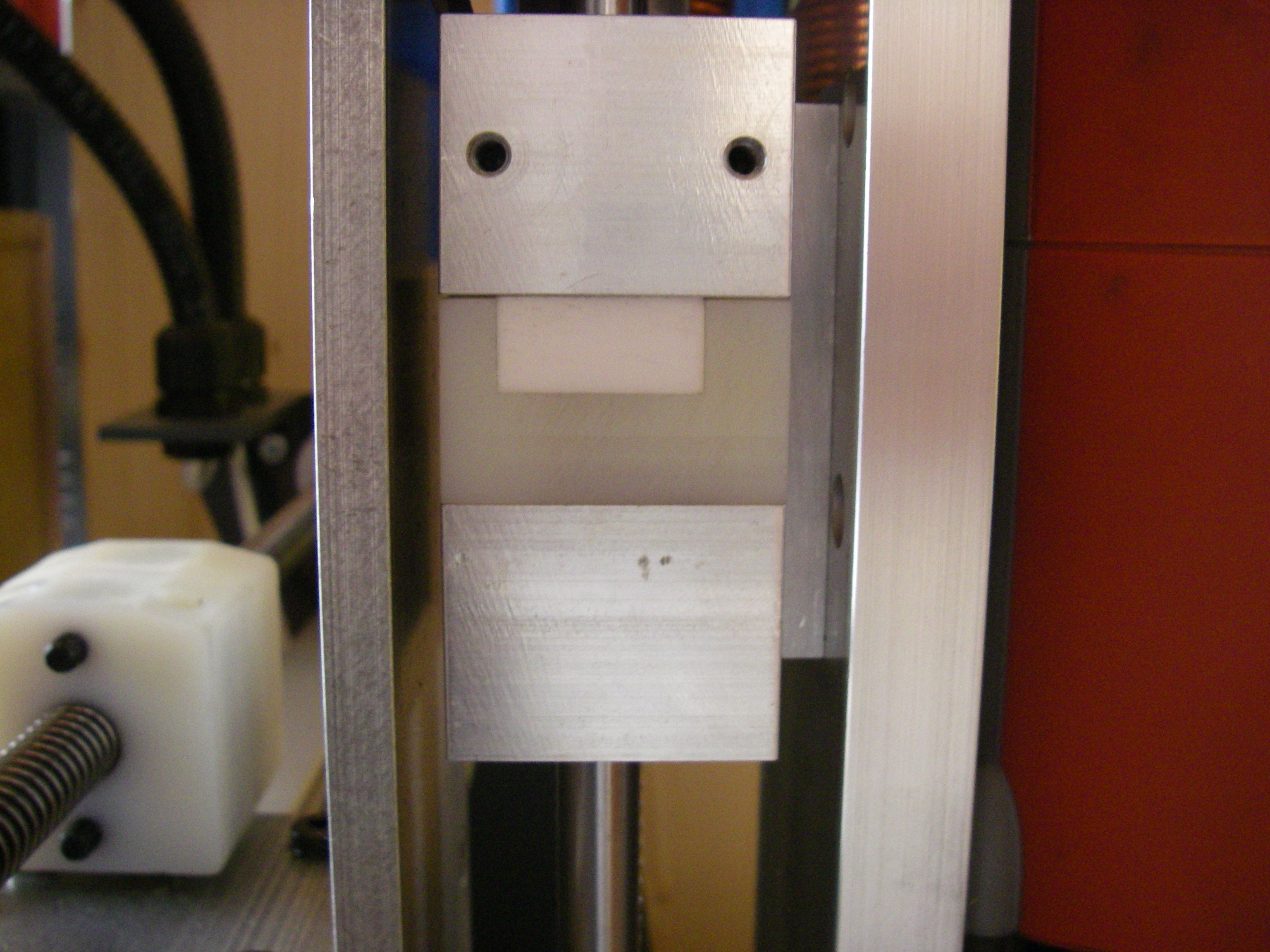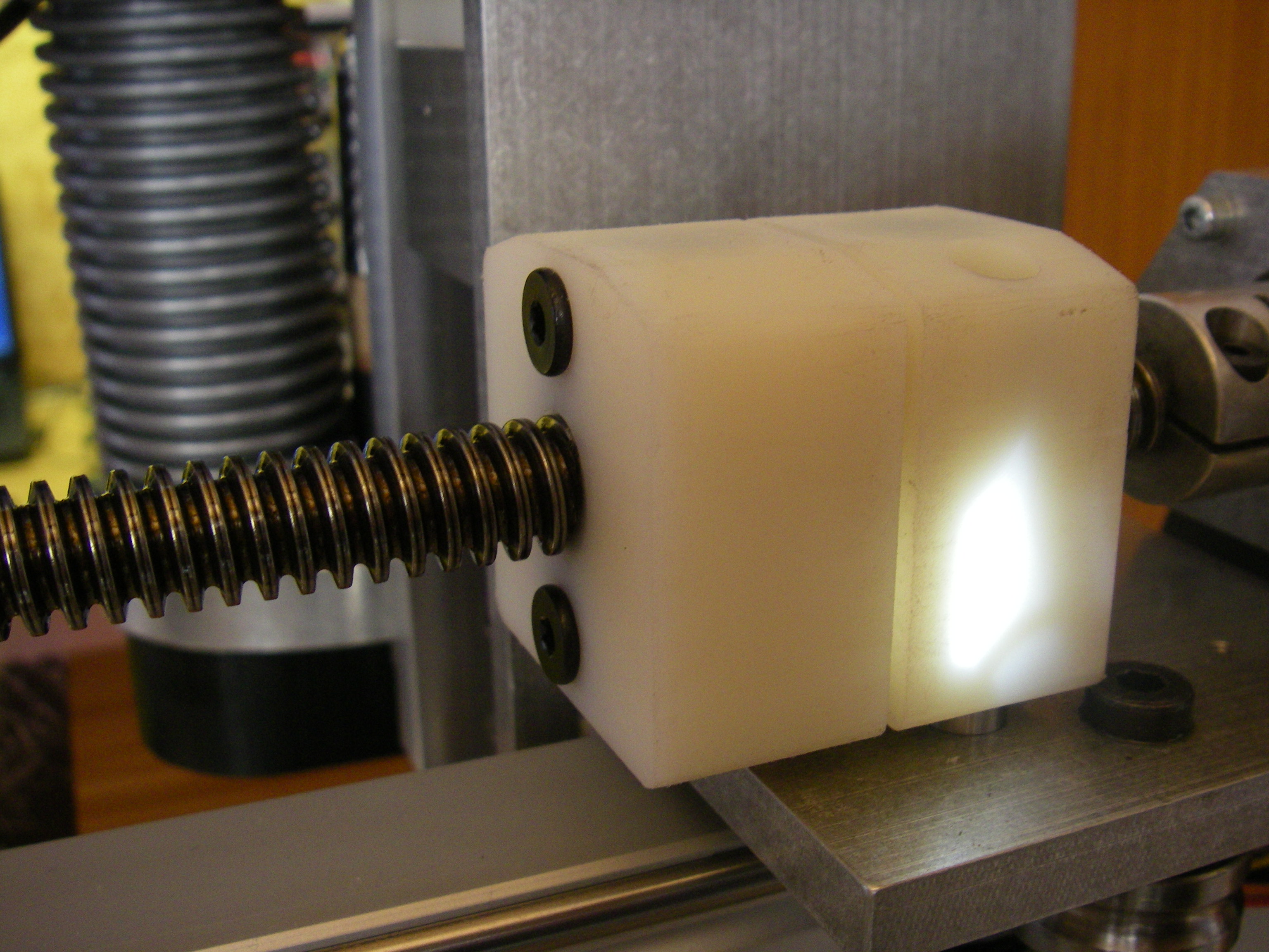 (In het originele ontwerp van Colinbus was hier gewoon een ovaal gat. Er waren dus twee raakpunten op de stalen assen. Dit moest het meedraaien van de glijmoer met de draadstang voorkomen, wat niet echt 100% werkte en dus een beetje onnauwkeurigheid veroorzaakte. Deze onnauwkeurigheid blijkt nu van de baan te zijn.)