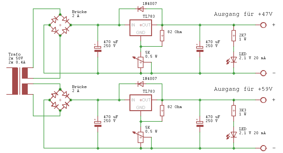 4. Hinter dem Ladekondensator kannst Du nun zwei (2) Spannungsregler z. B. TL783 (+47V und +59V) schalten.