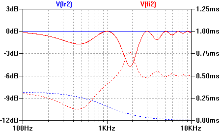 Ci-dessous une comparaison fréquentielle entre Linkwitz-Riley d'odre 2 (LR2) et Ibre (FI2, en rouge). Que ce soit en amplitude (trait plein) ou en délai de groupe (pointillé), il y a tout à perdre avec ce qu'a échafaudé Francis Ibre.En complément de l'analyse transitoire de cet autre message.