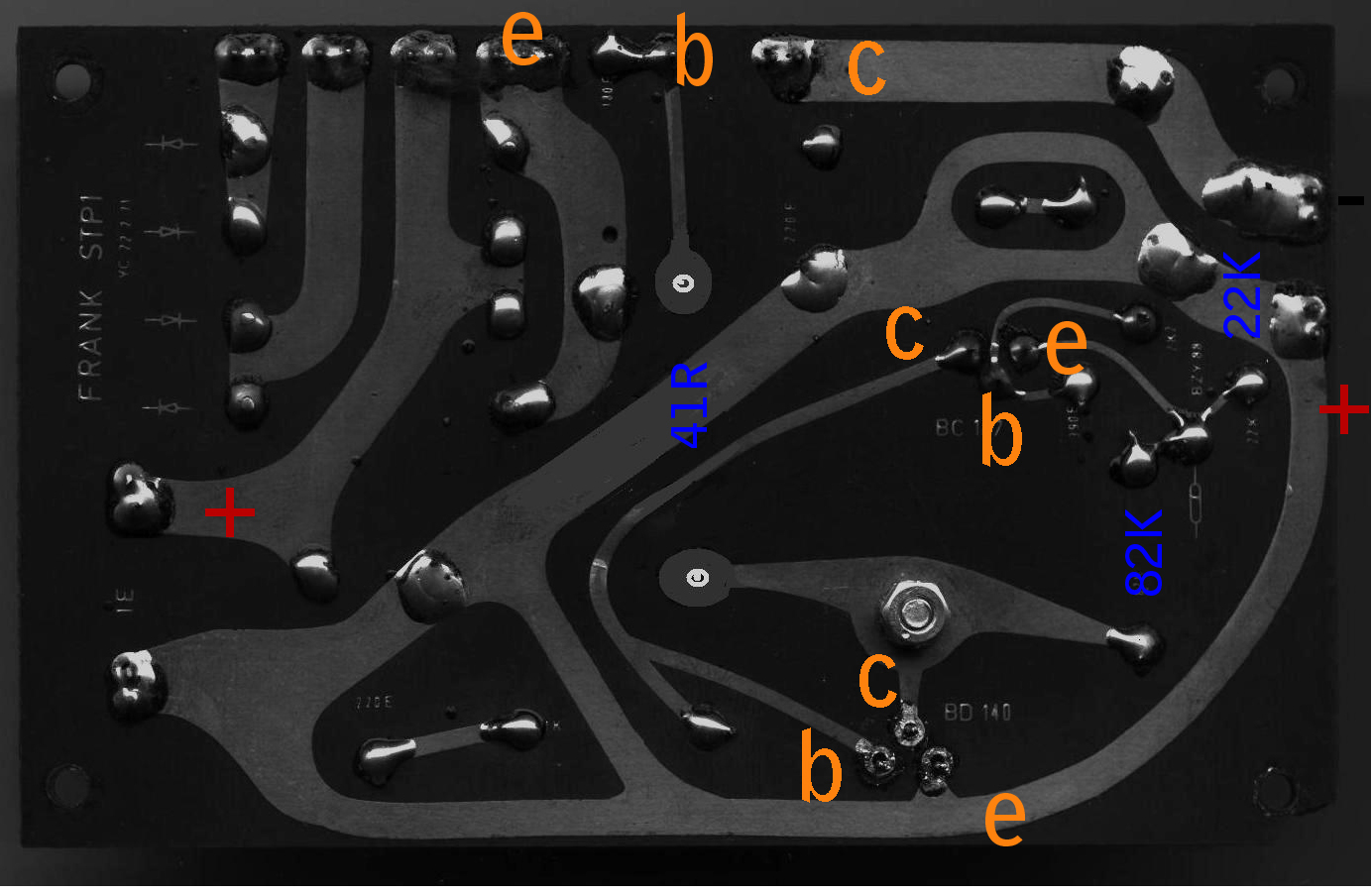 Je viens soliciter vos lumières car je suis face à un problème sur un ampli FRANK à transistors (Film & radio, marque belge plus connu pour ses amplis à tubes), qui a 45 ans, et j'ai revu beaucoup de chose dessus.