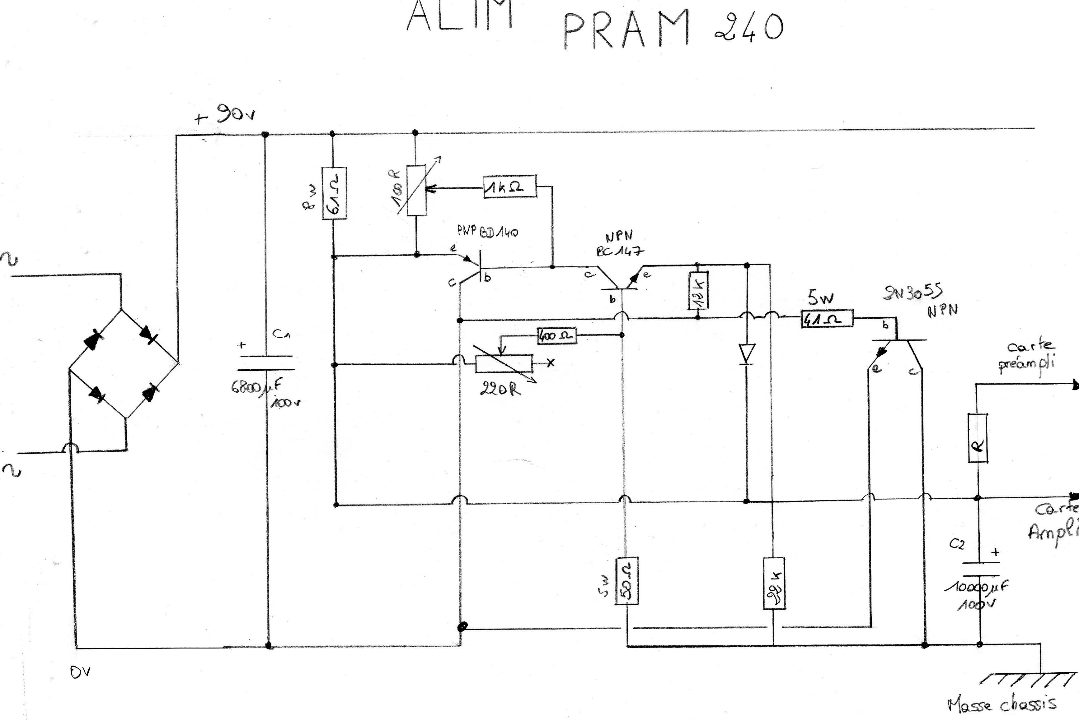C'est un schéma classique de l'époque, avec une alim asymétrique stabilisée et régulée qui délivre 90v, les transistors bipolaires sont les 2n3055 et avec donc des condensateurs de sorties (liaisons) contre les tension continues.