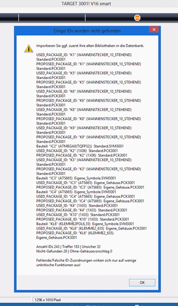 Nochmal zu der Bauteilinfo von Target: Es gab in der Versionsgeschichte eine Änderung der Bibliotheks-Datenbasis. Dadurch sind leider ein paar Informationen verlorengegangen, da die Target-Versionen der letzten Jahre eine andere Basis hatten. Nur mal ein kleines Beispiel...siehe Anhang. Das passiert, wenn ich die Platinenversion 2.1 vom 30.12.09 mit der aktuellen Target-Version öffne. Gruselig. Diese Info bedeutet erst mal viel Arbeit...