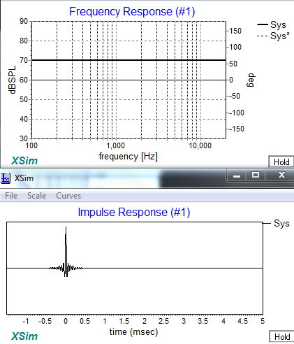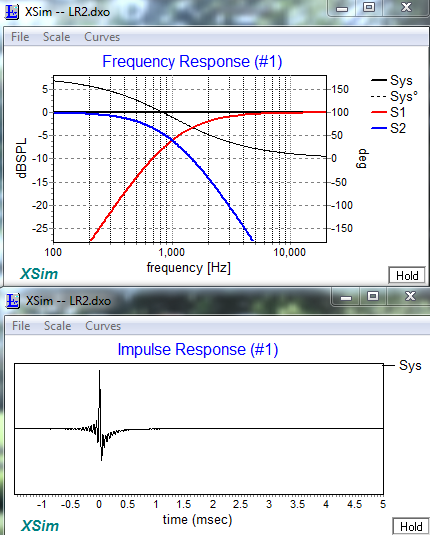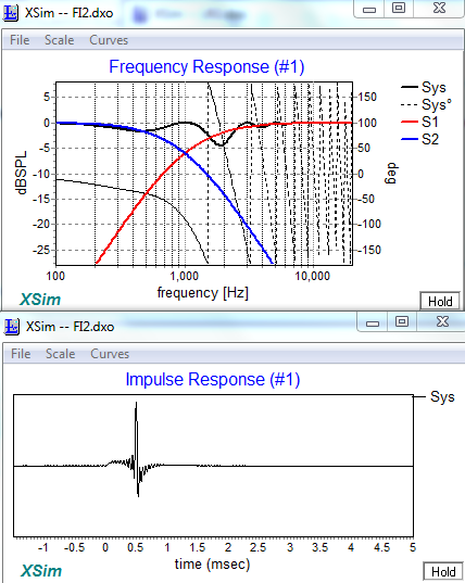 - Analogique (souvent à Aop) : des courbes électriques précises mais par l’ajout de la réponse des haut-parleurs, des cibles acoustiques finalement distantes. La somme est peu linéaire, voire moins linéaire qu’avec un filtre passif mis au point sous Xsim après mesures .frd et .zma.