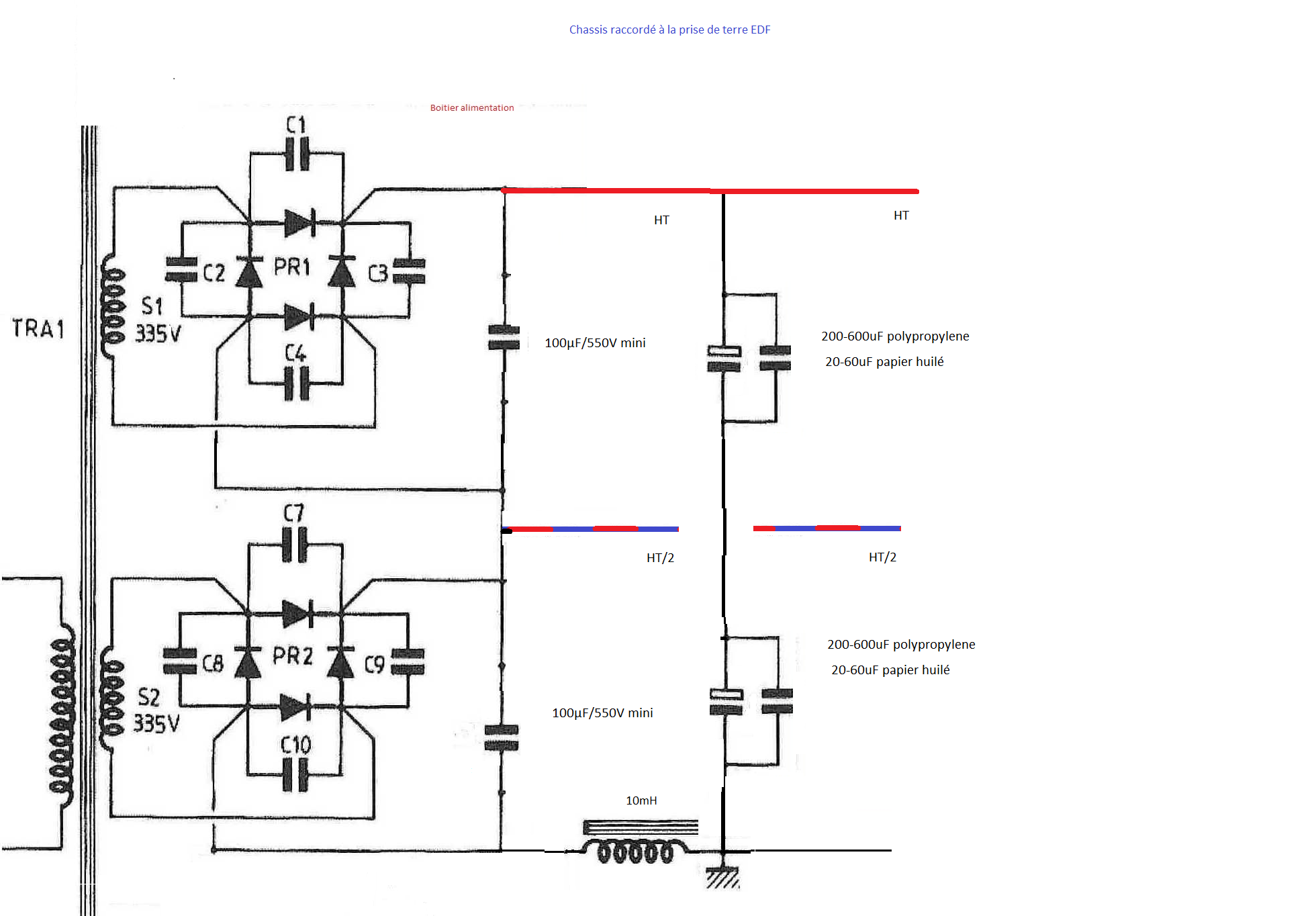 Ne pas réaliser la HT de 450 dans le boitier d’ampli ( Résistance pour de 950V redescendre à 450V) mais dans le boitier d’alimentation (point milieu des 2 condensateur de 500µF/500V.